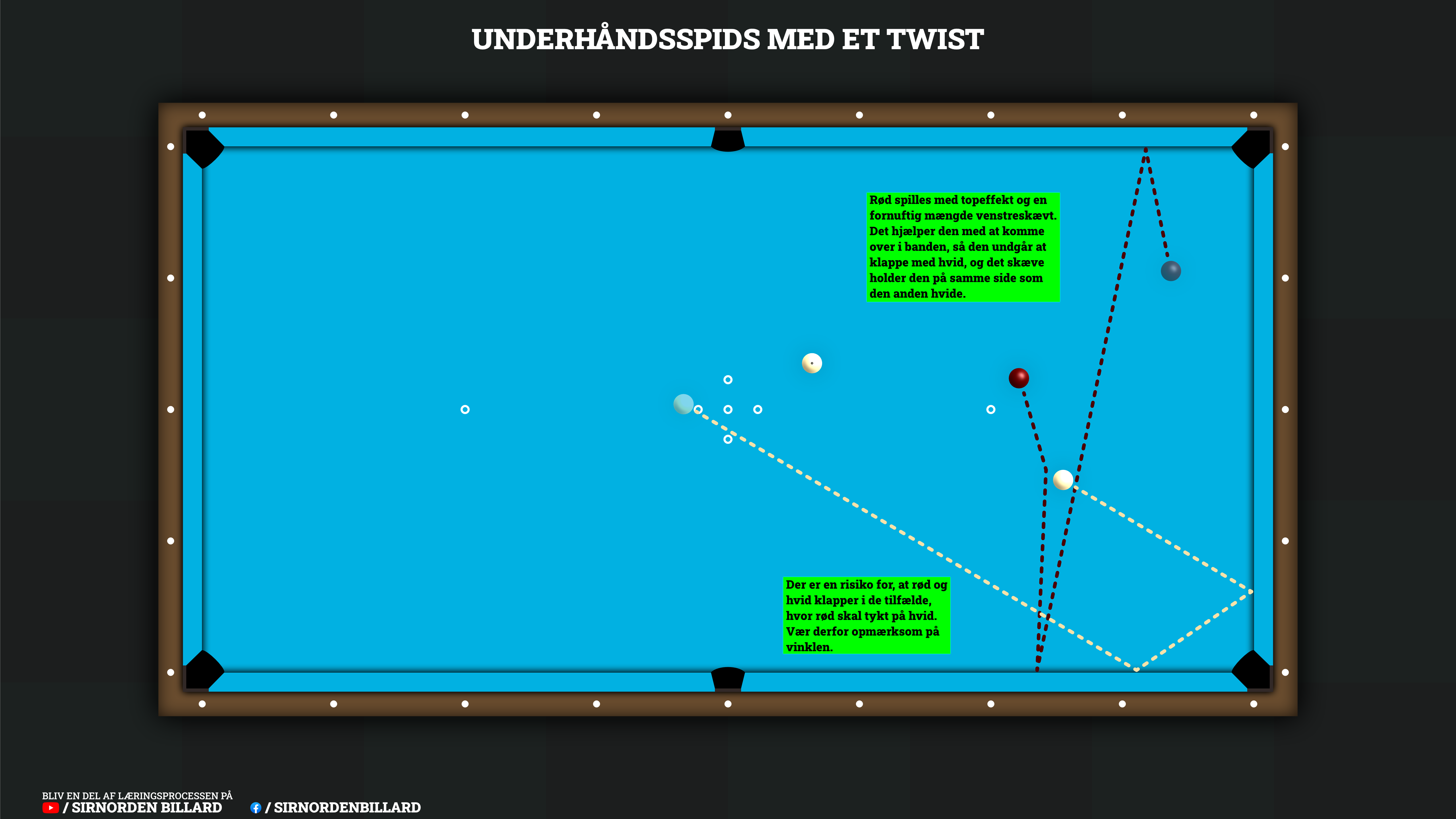 I denne situation kan vi faktisk spille vores underhåndsspids på en anden måde, og nogle vil finde denne model en smule lettere. Vi kan nemlig udnytte, at den anden hvide (bal 3) ligger på samme halvdel af bordet, så vi ikke længere behøver at have den røde med ned i den anden ende, men blot kan lade den løbe på tværs af bordet til en direktør.