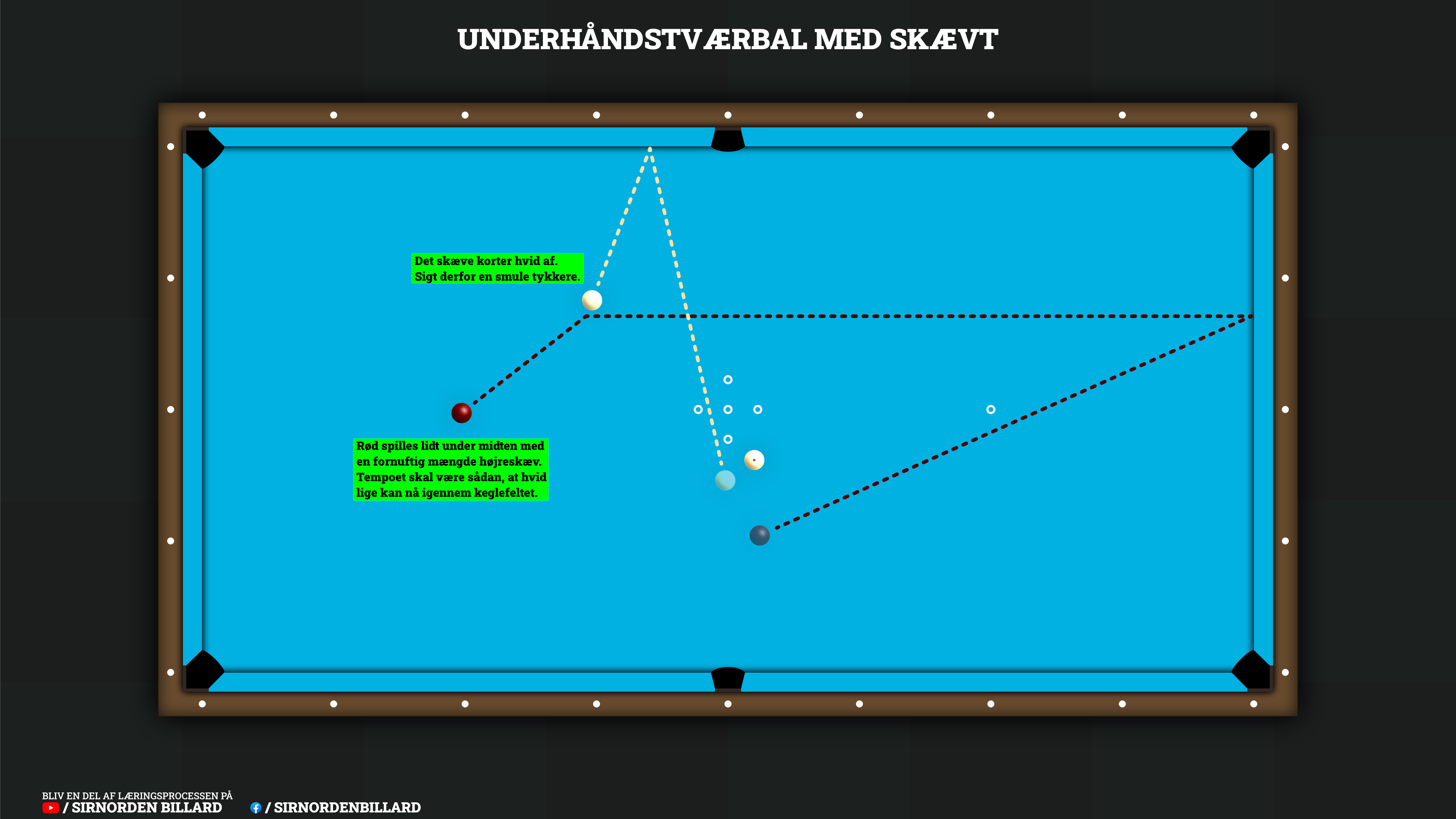 Lad os først se på, hvad der normalt sker ved en underhåndstværbal, og hvorfor det ofte spænder ben for en direktør. Det, der tit sker, er enten, at man støder rød for meget i toppen, så rød løber ned ad bordet og op igen - og alt efter hvor tyndt man rammer, løber den ofte for langt forbi keglefeltet, så der ikke er noget ordentligt at spille videre på. Der kan også ske det, at man spiller den med skævt ind mod den hvide, så den “åbner op”, når den rammer langbanden. Det er mange vant til, og for nogle gør det situationen nemmere, men resultatet er, at rød slår tilbage mod langbanden, når den rammer kortbanden. Begge dele er i sig selv fine nok, da de med kontrolleret tempo ofte resulterer i en ny underhåndstværbal, hvilket jo er et godt oplæg… det kan bare blive en smule bedre.