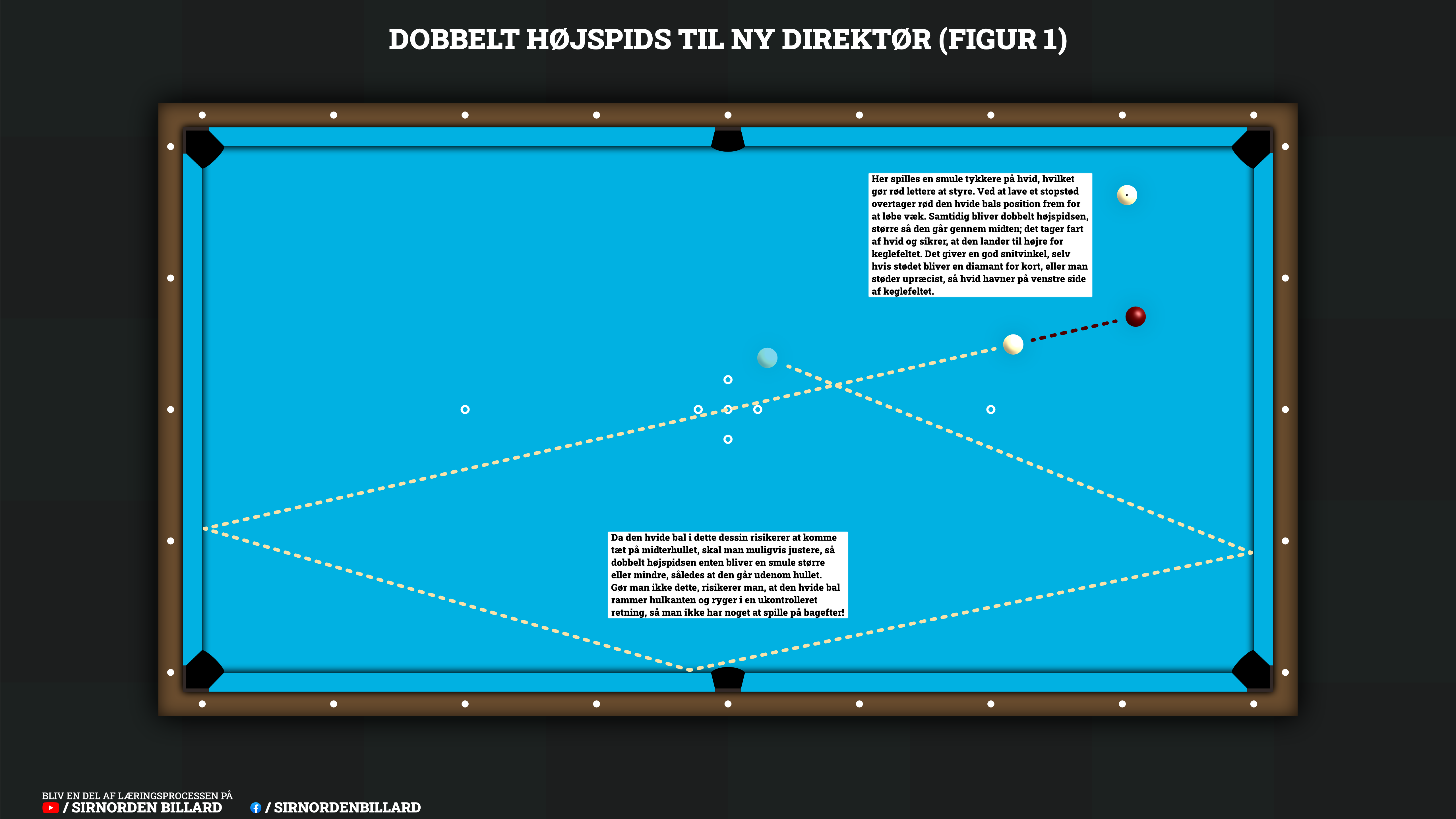 VIGTIGT: I mit eksempel og i videoen vælger jeg at støde hvid mod selve diamanten i stedet for kun 2/3 af vejen. Det gør jeg for at være sikker på, at hvid rammer langbanden inden hullet. Det tillader samtidig, at jeg kan støde lige på hvid, så rød kan kontrolleres bedst muligt med et stopstød. Det resulterer i, at dobbelt højspidsen bliver større og kommer ud længere til højre på bordet (set fra kortbanden) - men det gør ikke noget, da rød er stoppet i samme side.