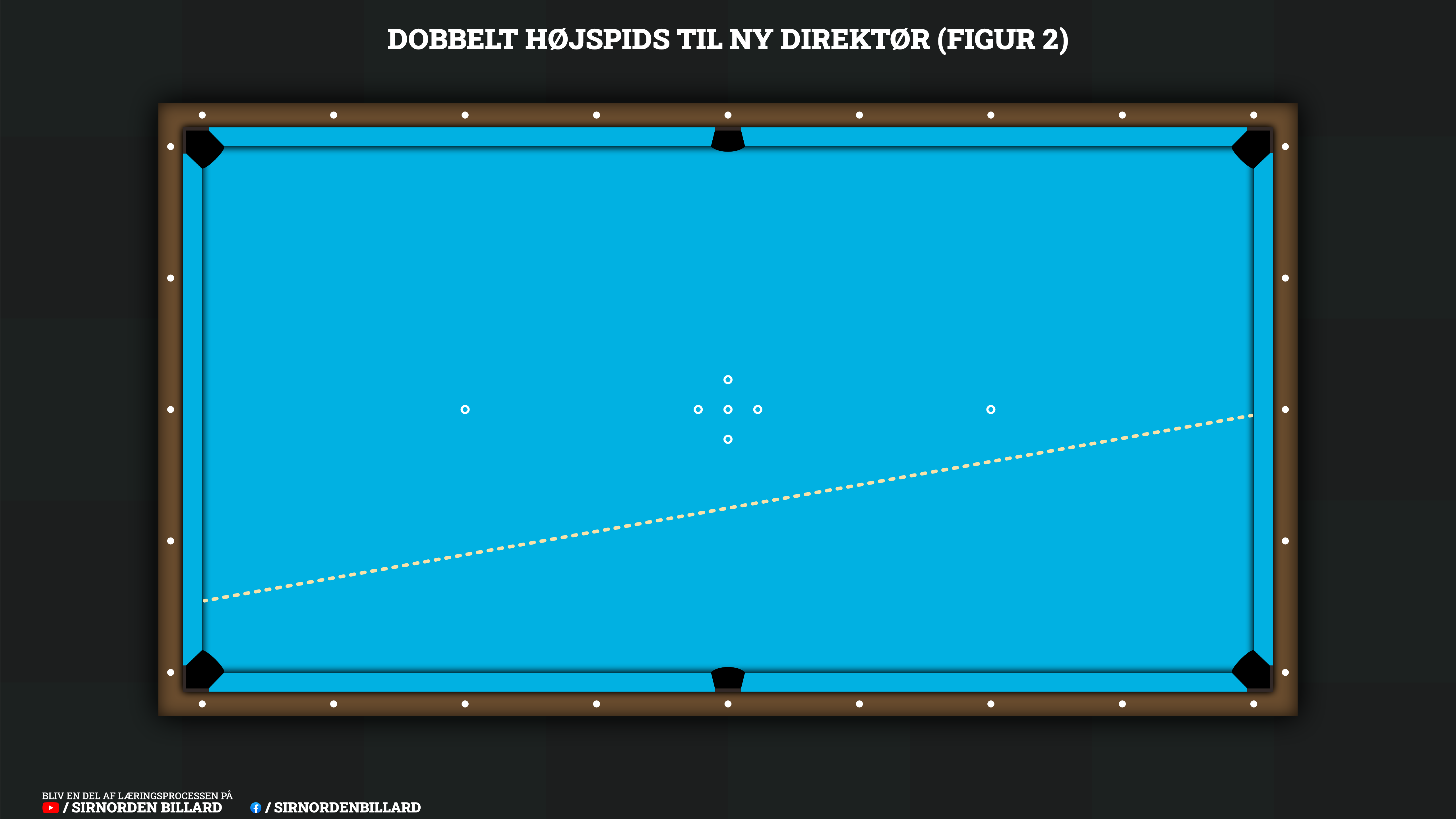 Bruger man grundlinjen for en dobbelt højspids som reference (se figur 2), går linjen fra midterdiamanten på den kortbande, man står ved, til halvvejs mellem diamanten ved hullet og den første diamant efter hullet ved den modsatte kortbande. Husk: Ikke alle borde er ens, så tjek altid bordet under opvarmningen og justér derefter - men linjen burde passe nogenlunde de fleste steder. Bruger vi denne linje og parallelforskyder den til midten af hvid, kan vi se, at hvid cirka skal ramme 2/3 af vejen mellem midterdiamanten og diamanten til venstre for denne på den modsatte kortbande. Det vil bringe hvid ind i en dobbelt højspids, der sender den tilbage mod midten af bordet.