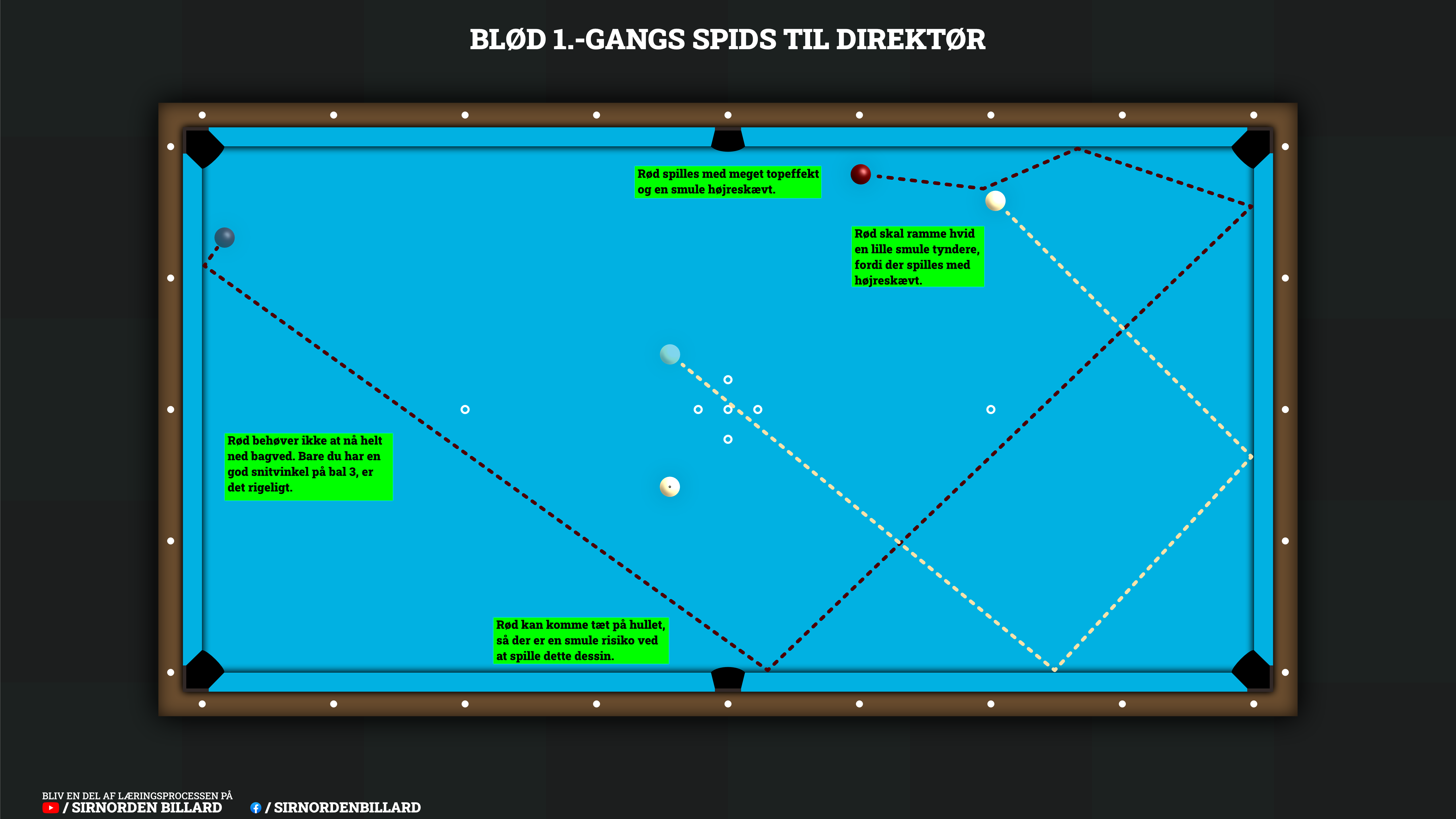 Hvis vi tager udgangspunkt i illustrationen og videoen, udnytter vi, at rød ligger tæt på langbanden. Tricket er her at spille med meget topeffekt og en smule løbende skævt (højreskævt i dette tilfælde, svarende til kl. 1:00 i vores ur-analogi). så skal du bare se løjer. Den røde sender som forventet hvid ind i en blød 1.-gangs spids og fortsætter ned og rammer langbanden og derefter kortbanden. Her åbner det højreskæve rød lidt op, så den løber på tværs af bordet, og rammer modsatte langbande hvorefter den ruller ned bag bal 3, og har du meget topeffekt i kan du endda få den til at løbe helt ned i kortbanden, således at du vil kunne spille på bal 2 igen. Voila! Du har lige fået en “direktør” ud af en blød 1.-gangs spids. Den kvikke iblandt os har allerede bemærket at, det er præcis samme teknik, som vi brugte til den “perfekte opsamlingsbal” (tværbal) i sidste uge - denne gang er det bare på langs af bordet.