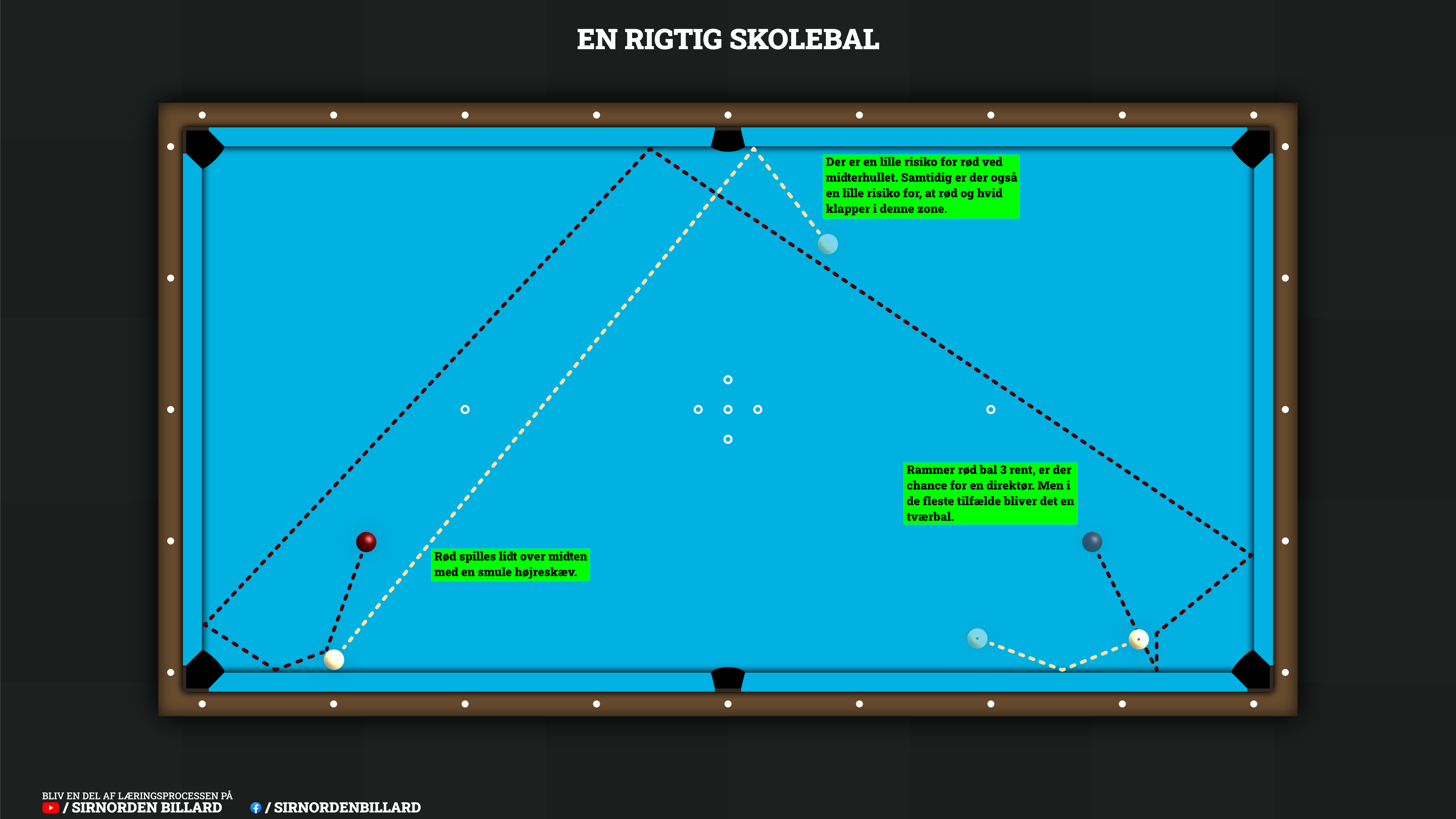 Hvorfor er det smart at spille den sådan tænker du nok. For det første arbejdes den første hvide bal naturligt op mod midten af bordet. Det vil sige, at den kommer væk fra hjørnet, uden at man skal kæmpe for det. Er man heldig at ramme den anden hvide helt rent, vil den blive sendt ind i langbanden og ud som en direktør. Rammer man derimod lidt tyndere (som jeg gør i videoen), vil det samme ske, men oplægget vil her være en tværbal, da hvid skubbes op ad banden og rød søger ud på bordet. Fællesnævneren er dog, at den anden hvide også bliver arbejdet op mod midten. Det er en succes, da vi nu har forvandlet et relativt ubrugeligt oplæg til noget meget brugbart blot ved at spille rødt - og så endda på en skolebal!