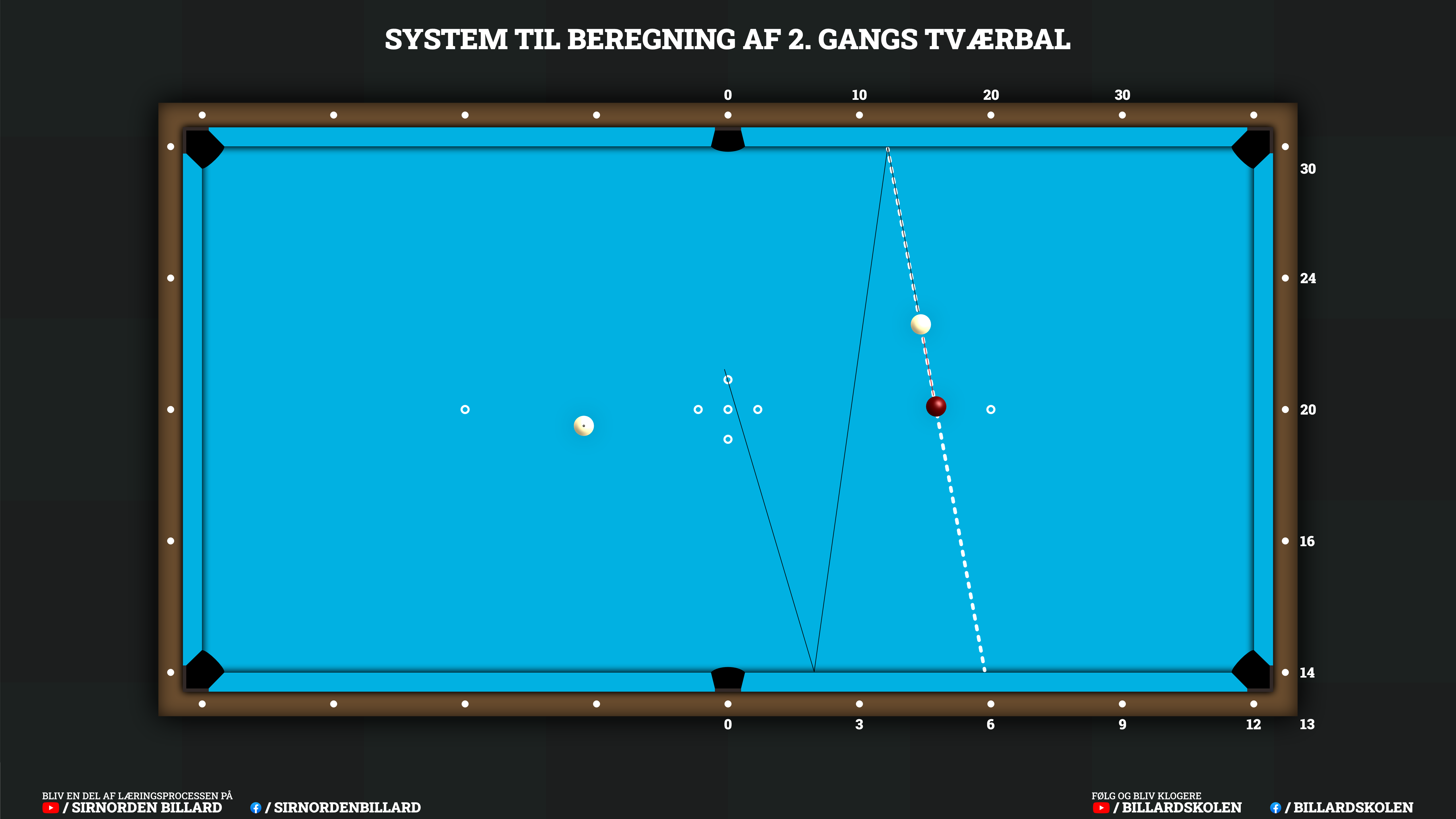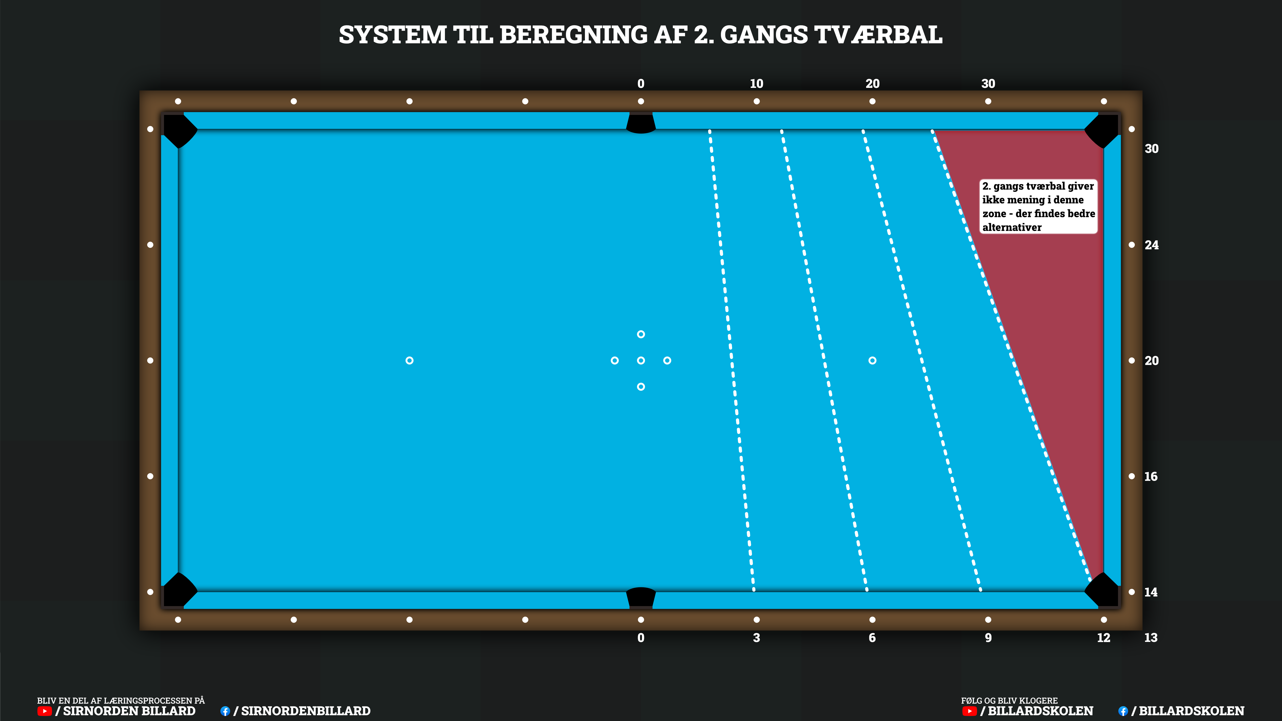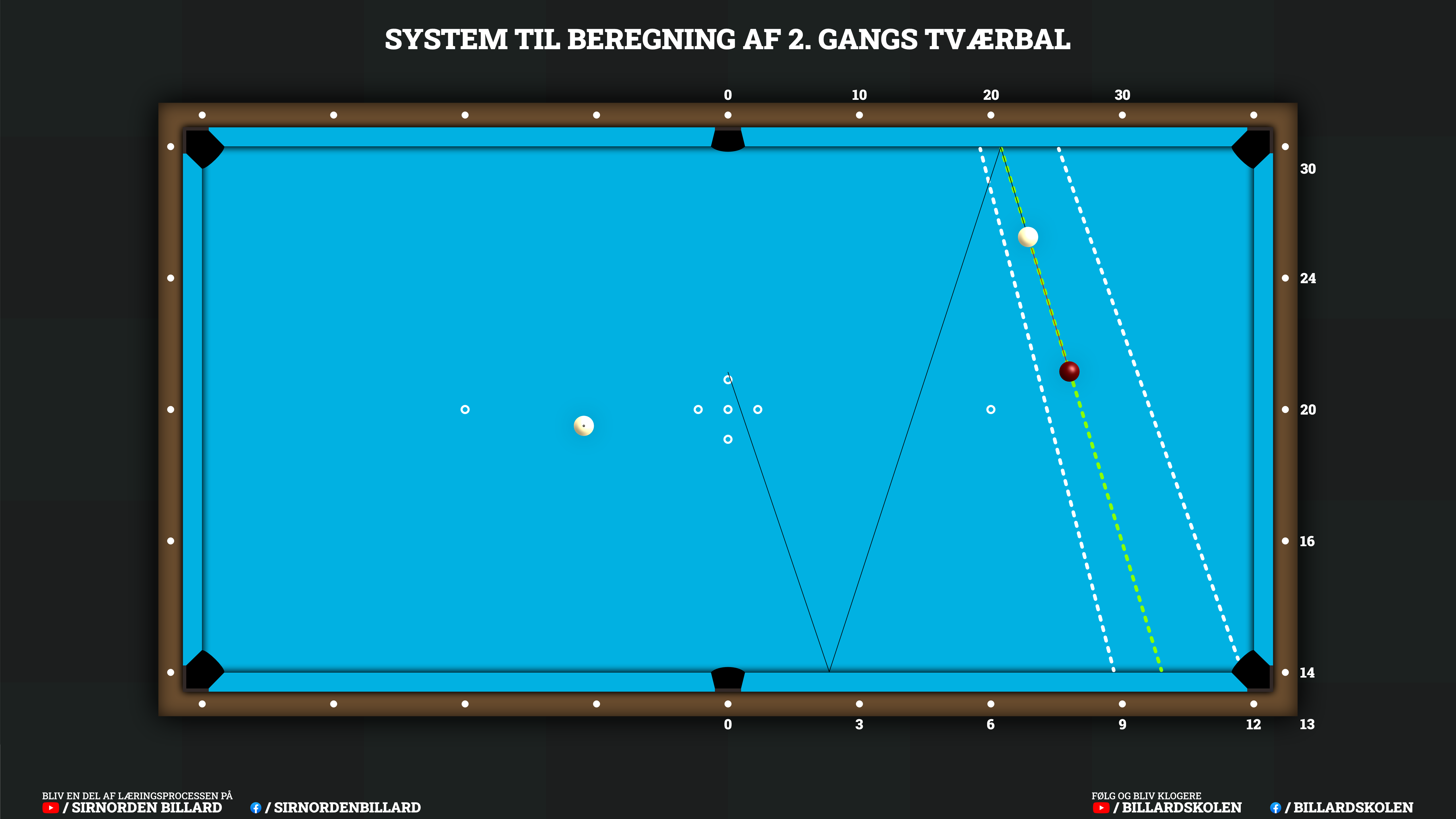 Her er et system til 2.-gangs tværbal, som jeg har udviklet i samarbejde med min gode ven Jimmy Lauridsen fra Billardskolen.dk. Det er baseret på et lignende system til, at beregne tværbal ved hjælp af diamanterne.